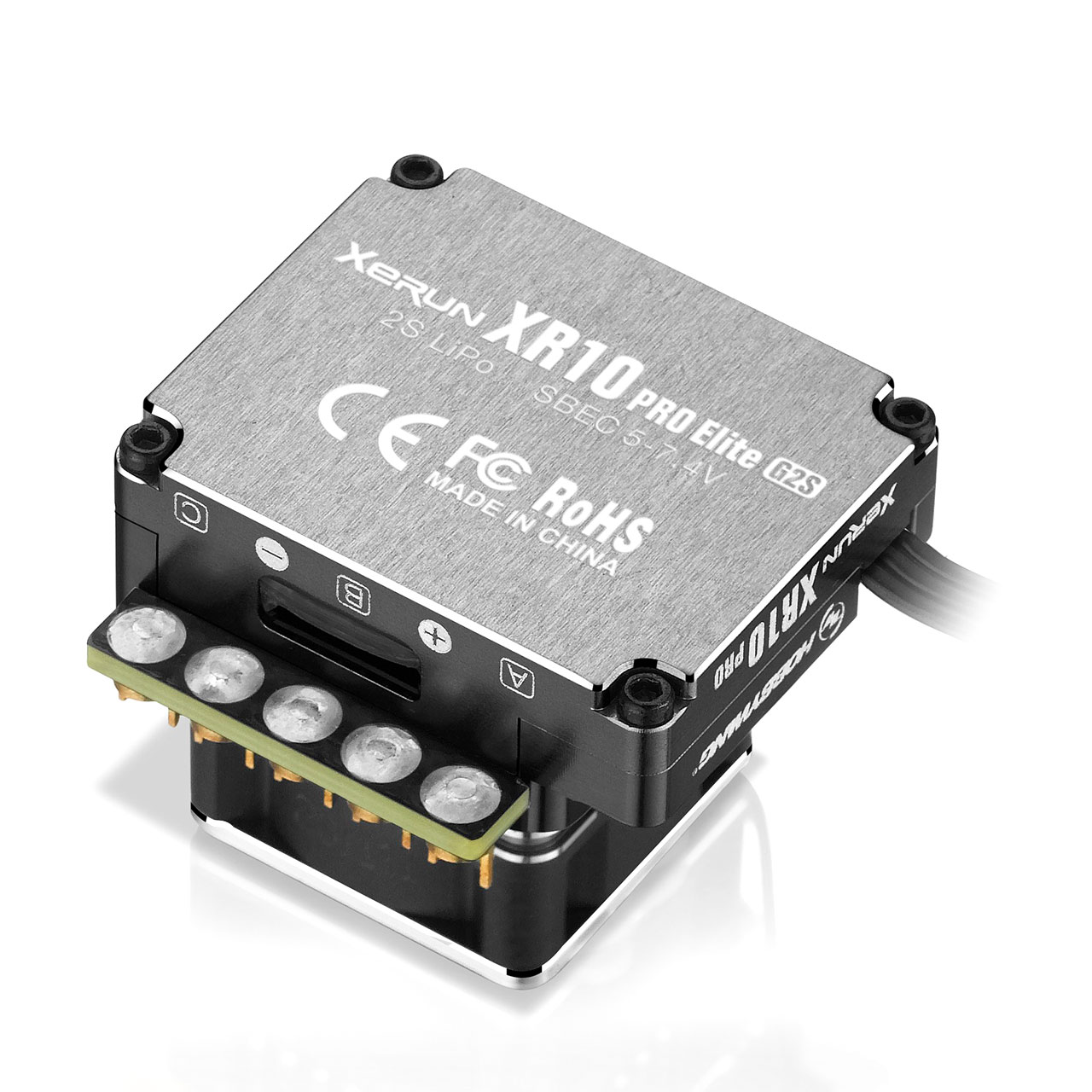 Der XR10 Pro Elite G2S macht in allen 1/10 Wettbewerben einfach eine gute und leichte Figur. Ausgestattet mit einem 32-bit M4 Mikroprozessor und diversen Sicherheitsfunktionen wird die Gefahr, dass die Austattung eines Fahrzeugs Schäden nimmt, minimiert. Dazu kommt, dass der Regler durch ein ausgeklügeltes Kühlsystem vor jeglicher Überhitzung geschützt ist. Der kupferne Kühlkörper auf der Leistungsplatine verstärkt diesen Effekt auch noch einmal mehr.